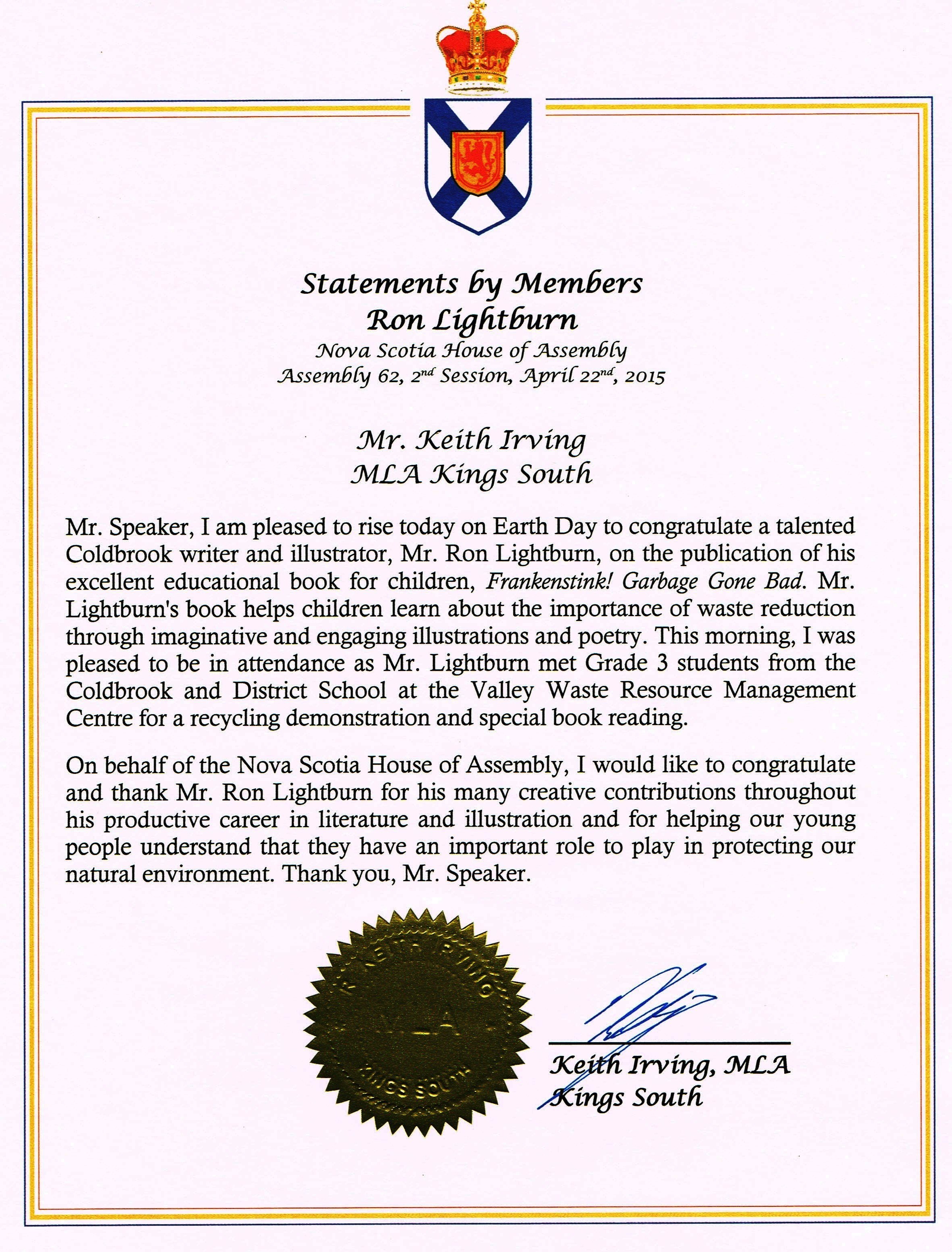 The certificates were statements read by Mr. Irving in the Nova Scotia Legislature during the past year, recognizing outstanding accomplishments by his constituents.