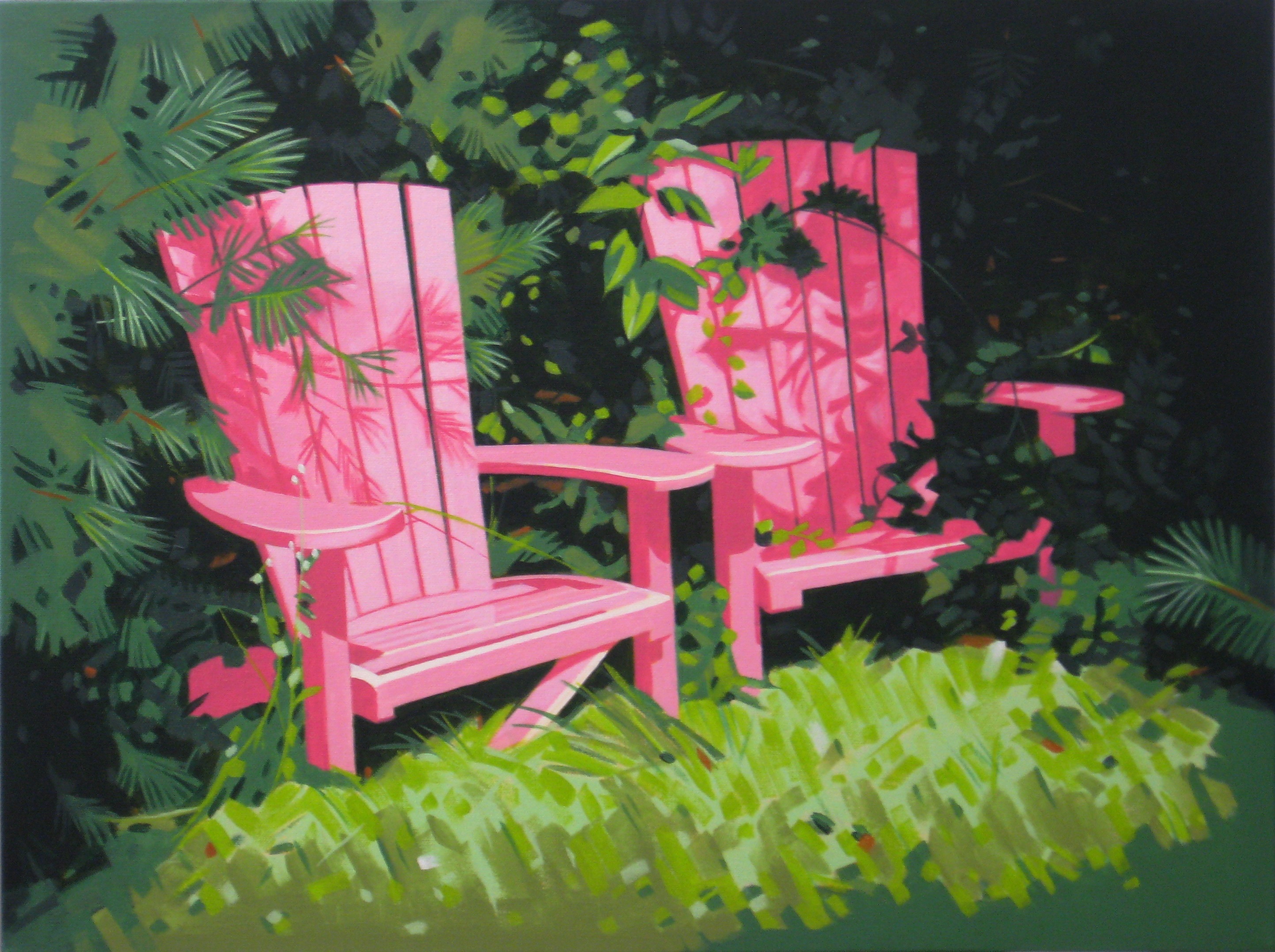 Ron has been working on a new series of paintings inspired by our garden and neighbourhood. These two chairs are tucked away in a quiet corner of our backyard. They have seen better days, but still provide a welcome splash of colour.