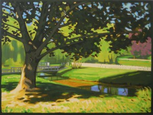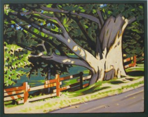 Summer Memories: From Ron’s series of paintings inspired by our garden and neighbourhood. We pass this tree each day on our walk to the post office.