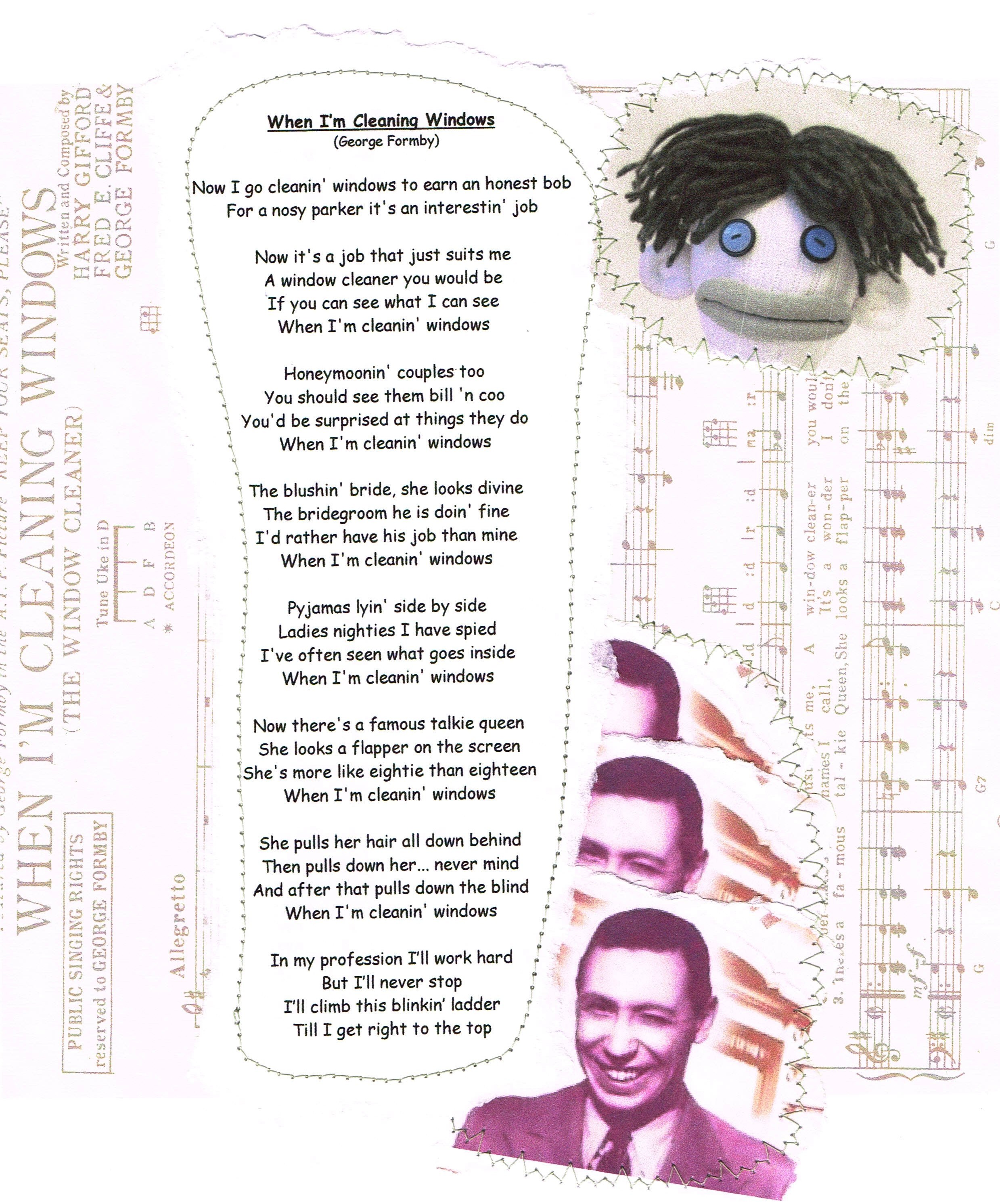 He righted the ladder and said that I had to clean up his window cleaning water that had spilled all over the floor. But since Jake is really an old softie at heart, he said he would entertain me while I mopped up. He climbed his ladder, got himself all comfy at the top and sang for me his favourite George Formby song, “When I’m Cleaning Windows”.