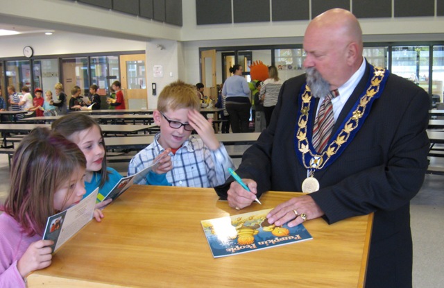Kentville Mayor Dave Corkum gave his annual reading of Pumpkin People to the Grade 3 students of KCA (Kings County Academy). Great job, Mayor Dave! As part of this tradition, the Town of Kentville gave a free copy of the book to each Grade 3 student. The town has generously donated copies to KCA students since 2008 to promote literacy and Kentville culture. Spike the pumpkin person also joined in the fun!